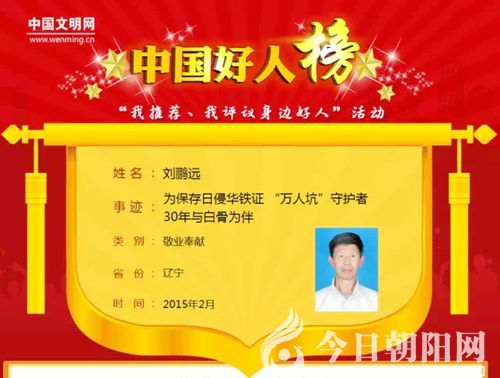 有熟人問(wèn)他,你三十年不離不棄與白骨作伴究竟為的是什么?劉鵬遠(yuǎn)不假思索地答道:“就是想讓更多的人知道北票有個(gè)萬(wàn)人坑。讓它時(shí)刻警醒我們的子孫不忘歷史,不忘國(guó)恥,愛(ài)我中華?,F(xiàn)在日本右翼勢(shì)力極力毀掉北票臺(tái)吉“萬(wàn)人坑”的證據(jù),其行徑極其令人憤慨,這也更激起我保護(hù)好“萬(wàn)人坑”的決心。能為子孫后代留下一部完整的歷史教科書(shū),我一生足矣。”