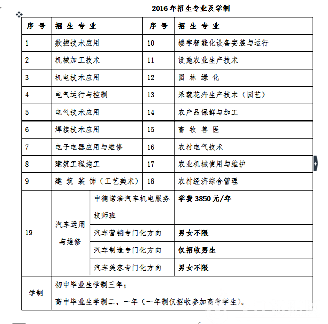 學(xué)?,F(xiàn)開設(shè)加工制造、交通運(yùn)輸、土木工程、農(nóng)林牧四大類共19個(gè)專業(yè)。其中,中央財(cái)政支持的重點(diǎn)建設(shè)專業(yè)4個(gè),省級(jí)示范專業(yè)6個(gè)。學(xué)校設(shè)有5個(gè)實(shí)訓(xùn)基地,其中數(shù)控和汽車為國家級(jí)實(shí)訓(xùn)基地,另有60個(gè)實(shí)訓(xùn)實(shí)驗(yàn)室。學(xué)校還設(shè)有建筑設(shè)計(jì)室、汽車駕駛員培訓(xùn)基地。