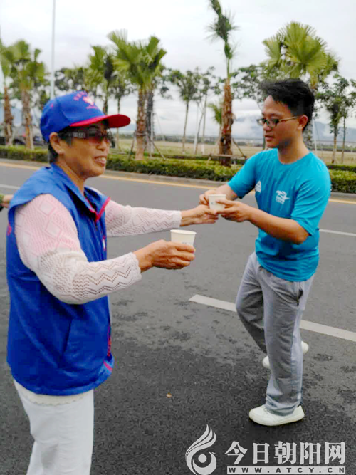 朝陽市人民公園群藝合唱團(tuán)歌友 李秀敏為馬拉松運(yùn)動(dòng)員遞水