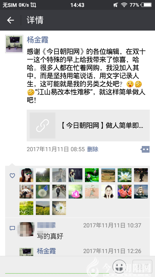 劉顧問把我拉到兩個(gè)群里,一個(gè)是“今日朝陽網(wǎng)文化信使交流群”,一個(gè)是“今日朝陽教體群”。在這兩個(gè)群里,我結(jié)識了很多志同道合的朋友,與大家共同交流,共同進(jìn)步。我在群里也是比較活躍的一份子,積極分享有價(jià)值的教育信息,對別人寫的文章偶爾也會發(fā)表自己的評論?!督袢粘柧W(wǎng)》編輯趙威姐姐一直默默關(guān)注著我的朋友圈,她曾經(jīng)這樣高度評價(jià)我,使我受寵若驚。今日朝陽網(wǎng)的各位編輯也都說我渾身充滿了正能量,我朋友圈的很多好友更是時(shí)刻關(guān)注著我,很多“說說”都是秒贊。