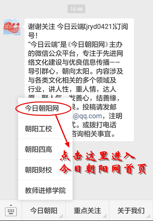 步驟一:掃描或長按二維碼,關(guān)注《今日朝陽網(wǎng)》官方微信公眾號(微信名:“今日云端” jryd0421)