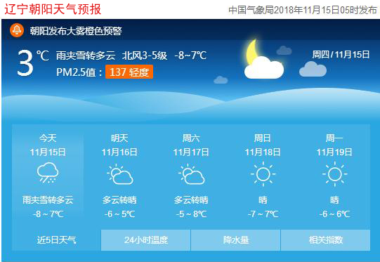 親愛的網(wǎng)友們,大家早上好!早起的您是不是迫不及待地想知道今天的天氣情況呢?今天(11月15日),遼寧朝陽(yáng)雨夾雪轉(zhuǎn)多云,最低氣溫-8℃,最高氣溫7℃,北風(fēng)3~5級(jí)。雨雪天氣,氣溫驟降,建議外出的網(wǎng)友穿羽絨服、厚棉服等冬季服裝,年老體弱者及兒童應(yīng)盡量減少外出。喜歡運(yùn)動(dòng)的朋友推薦您進(jìn)行室內(nèi)運(yùn)動(dòng),戶外運(yùn)動(dòng)時(shí)請(qǐng)注意保暖。