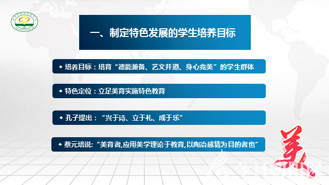 學(xué)校堅(jiān)持“以美育人”,全面提高學(xué)生審美和人文素養(yǎng)的辦學(xué)要求,堅(jiān)持以特色教育帶動(dòng)學(xué)校發(fā)展,從“辦適合學(xué)生的教育,辦人人發(fā)展的教育”的辦學(xué)理念出發(fā),以培育“德能兼?zhèn)?、藝文并遒、身心?jìng)美”的學(xué)生群體為培養(yǎng)目標(biāo),大力實(shí)施特色教育。