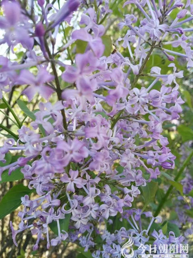紫丁香層層疊疊的花穗是由一朵朵精致的小花組成的,每一朵小花有四個(gè)水滴形的花瓣,兩個(gè)一組,就像一對(duì)可愛的翅膀,茂盛的葉蒼翠欲滴。