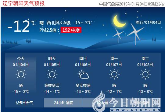 今天是2019年1月4日,星期五,農(nóng)歷十一月二十九。遼寧朝陽晴,氣溫-15~-3℃,西北風(fēng)3~5級,空氣質(zhì)量不好,屬中度污染,應(yīng)減少外出,減少開窗,室內(nèi)開啟凈化器,敏感人員外出時要戴口罩。日出時間:07:25;日落時間:16:40。