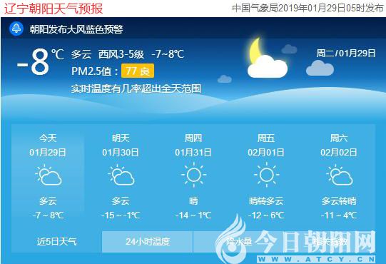 今天是2019年1月29日,星期二,農(nóng)歷臘月二十四,“五九”第三天。遼寧朝陽(yáng)晴轉(zhuǎn)多云,氣溫-7~8℃,西風(fēng)3~5級(jí),空氣質(zhì)量良好。日出時(shí)間:07:15;日落時(shí)間:17:08。