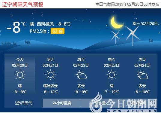今天是2019年2月20日,星期三,農(nóng)歷正月十六,“七九”第七天。遼寧朝陽晴,氣溫-8~8℃,西北風(fēng)3~5級(jí),空氣質(zhì)量良好。日出時(shí)間:06:49;日落時(shí)間:17:36。