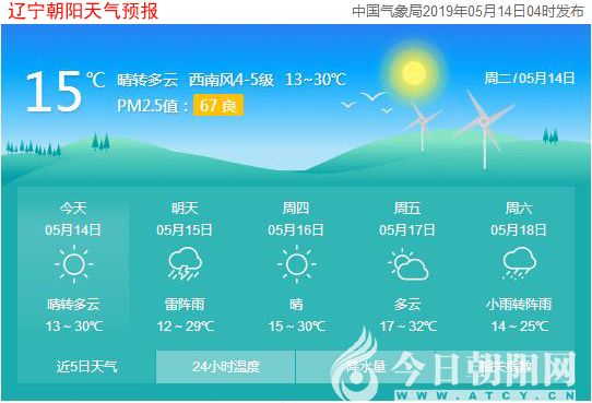 今天是2019年5月14日,星期二,農(nóng)歷四月初十。遼寧朝陽(yáng)晴轉(zhuǎn)多云,氣溫13~30℃,西南風(fēng)4~5級(jí),空氣質(zhì)量良好。日出時(shí)間:04:42;日落時(shí)間:19:08。