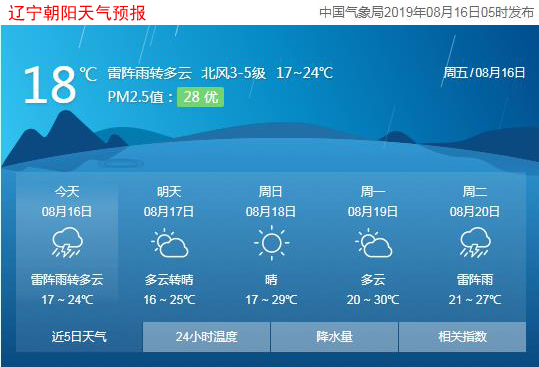 今天是2019年8月16日,星期五,農(nóng)歷七月十六,末伏第六天。遼寧朝陽雷陣雨轉(zhuǎn)多云,氣溫17~24℃,北風(fēng)3~5級,空氣質(zhì)量優(yōu)。日出時間:05:06;日落時間:18:58。(數(shù)據(jù)來源于中國氣象局2019年08月16日05時發(fā)布,請隨時關(guān)注天氣變化。)