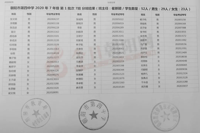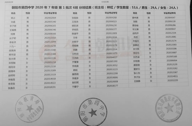 朝陽市第四中學(xué)2020年新生分班表(可點(diǎn)擊放大查看)