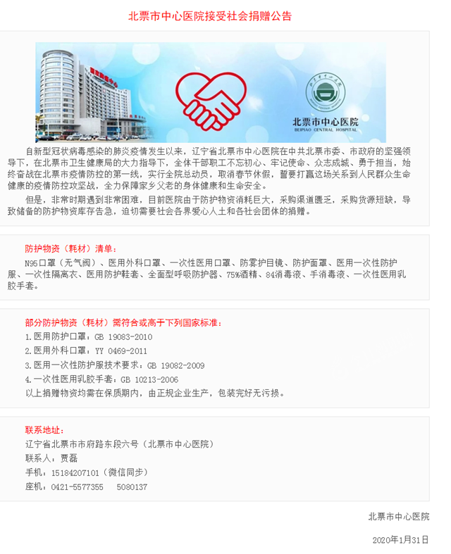 【眾志成城 抗擊疫情】北票市中心醫(yī)院感謝社會各界愛心捐贈