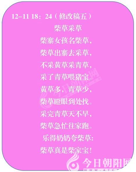 劉老師想到把這兩個字寫進一則繞口令,于是構思了一個姓柴名草的女孩兒打豬草受到奶奶夸獎的故事,幾經(jīng)修改,形成了繞口令《柴草采草》。草稿完成后,傳到喀左王學英手里,又加以潤色。