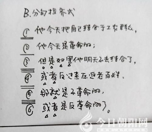 樣式二,分句拉齊式:本是粘連散文語,分句拉齊如詩行。關(guān)聯(lián)詞語得彰顯,撥云見日不迷航。游刃有余析難句,頓悟此方勝前方。(參見圖B、C、D例句)