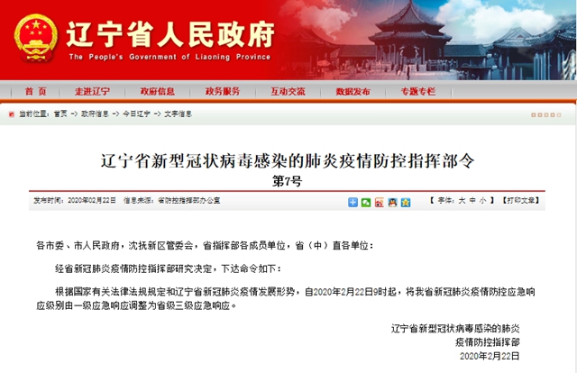 根據(jù)國家有關(guān)法律法規(guī)規(guī)定和遼寧省新冠肺炎疫情發(fā)展形勢,自2020年2月22日9時(shí)起,將我省新冠肺炎疫情防控應(yīng)急響應(yīng)級別由一級應(yīng)急響應(yīng)調(diào)整為省級三級應(yīng)急響應(yīng)。