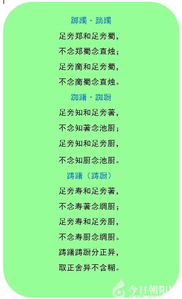 足旁鄭和足旁蜀,不念鄭蜀念直燭。足旁啇和足旁蜀,不念啇蜀念直燭。足旁知和足旁著,不念知著念池廚,足旁知和足旁廚,不念知廚念池廚。足旁壽和足旁著,不念壽著念綢廚。足旁壽和足旁廚,不念壽廚念綢廚。躊躇躊躕分正異,取正舍異不含糊。