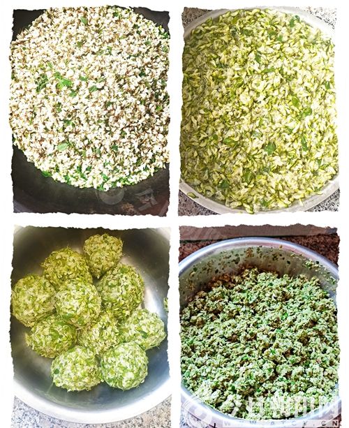 將鍋里填好合適的水,生起灶膛里的火,待水燒開,倒進槐花,迅速打個滾,焯一下,然后撈出,在涼水中浸泡幾分鐘,再換一遍干凈的涼水,雙手用力將已焯好的槐花攥成團,再拿到菜板上剁幾下,去除多余的水,做成餡,上面點綴著用葵花油炒好的瘦肉丁。