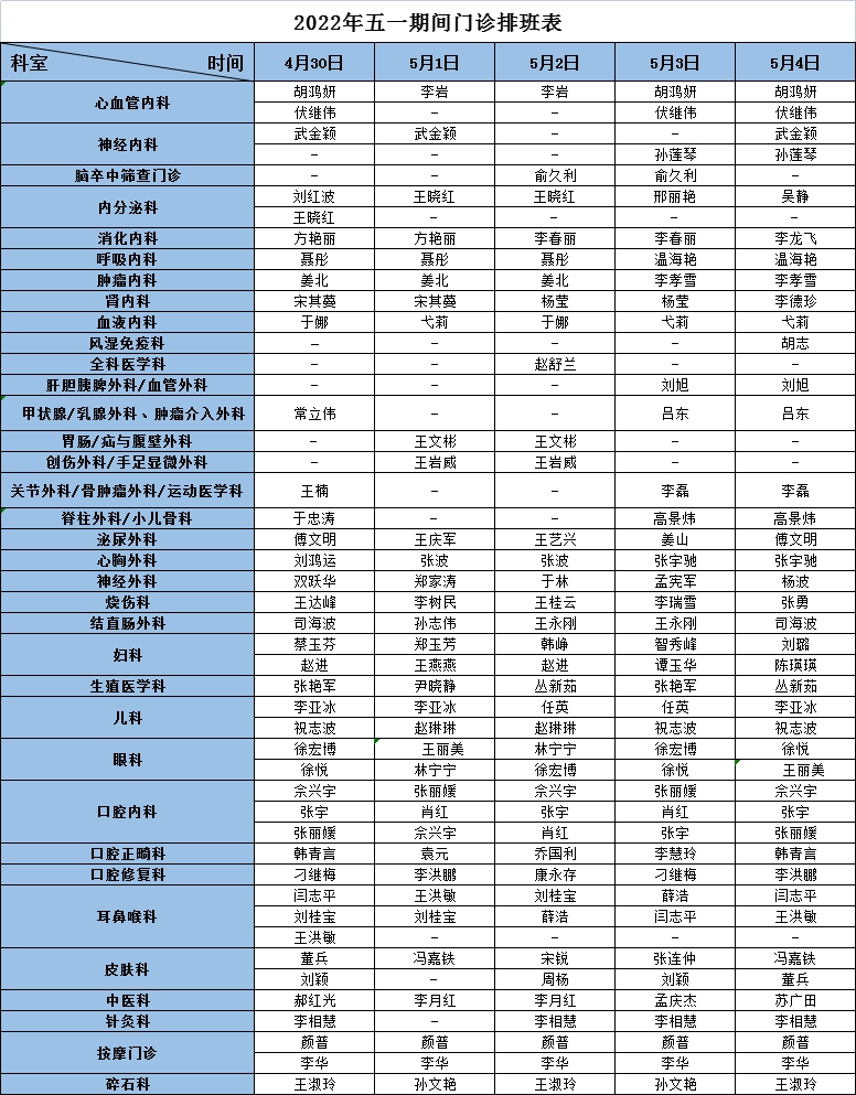 為方便市民朋友們節(jié)假日期間就醫(yī),結(jié)合醫(yī)院門診實(shí)際情況,五一假期(4月30日至5月4日),遼寧省朝陽市中心醫(yī)院普通門診正常開診;急診、發(fā)熱門診、核酸檢測(cè)門診24小時(shí)開診;專家門診、專病門診停診。門診具體排班如下: